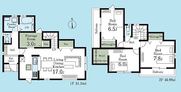 | 間取り | 3SLDK 間取り内訳:洋室 7.8帖(2階)・洋室 6.5帖(2階)・洋室 6帖(2階)・リビングダイニングキッチン 17帖(1階)・収納 3帖(1階) |