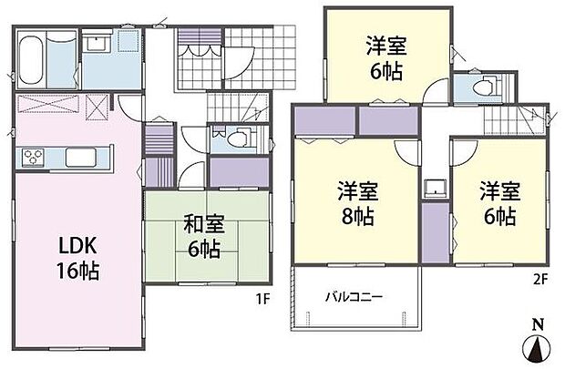 | 間取り | 4LDK 間取り内訳:リビングダイニングキッチン 16帖(1階)・和室 6畳(1階)・洋室 8帖(2階)・洋室 6帖(2階)・洋室 6帖(2階) |