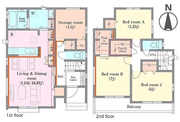 | 間取り | 3SLDK 間取り内訳:リビングダイニングキッチン 16.8帖(1階)・収納 4.5帖(1階)・洋室 7帖(2階)・洋室 6帖(2階)・洋室 5.2帖(2階) |