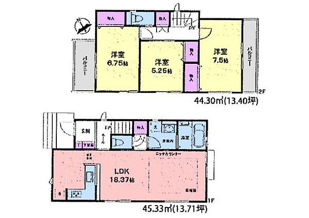 | 間取り | 3LDK 間取り内訳:リビングダイニングキッチン 18.3帖(1階)・洋室 7.5帖(2階)・洋室 6.7帖(2階)・洋室 5.2帖(2階) |