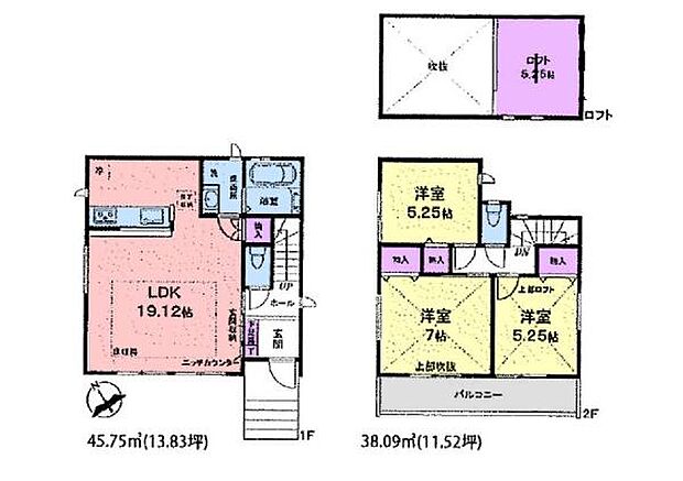 | 間取り | 3LDK 間取り内訳:リビングダイニングキッチン 19.1帖(1階)・洋室 7帖(2階)・洋室 5.2帖(2階)・洋室 5.2帖(2階) |