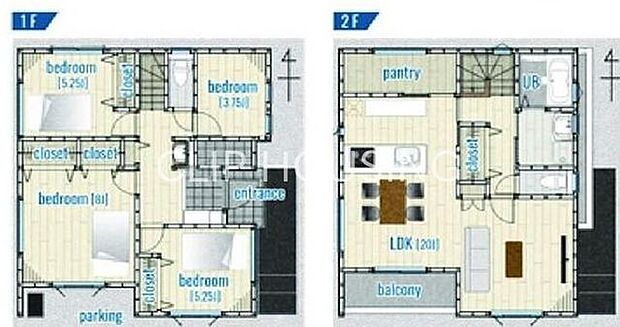| 間取り | 3SLDK 間取り内訳:洋室 8帖(1階)・洋室 5.2帖(1階)・洋室 5.2帖(1階)・収納 3.7帖(1階)・リビングダイニングキッチン(2階) |