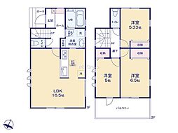 | 間取り | 3LDK 間取り内訳:リビングダイニングキッチン 16.5帖(1階)・洋室 5帖(2階)・洋室 5.3帖(2階)・洋室 6.5帖(2階) |