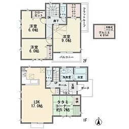 | 間取り | 4LDK 間取り内訳:リビングダイニングキッチン 17帖(1階)・和室 5.2畳(1階)・洋室 9帖(2階)・洋室 6帖(2階)x2 |