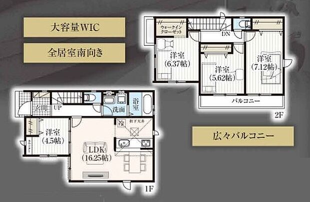 全2棟、全居室南向き、LDK16帖以上、カウンターキッチン、主寝室7帖以上、全居室収納有、WIC有、