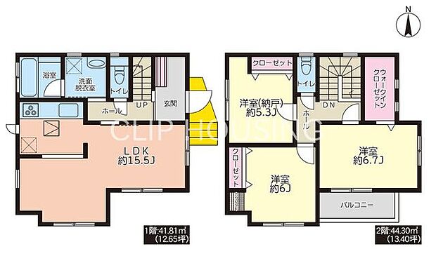 | 間取り | 3LDK 間取り内訳:リビングダイニングキッチン 15.5帖(1階)・洋室 6帖(2階)・洋室 6.7帖(2階)・洋室 5.3帖(2階) |