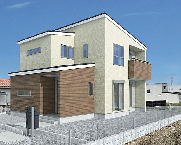 外壁の貼り分けが印象的で、ひときわ目を引くデザインとなっております。※現地写真にパースを合成したものです。