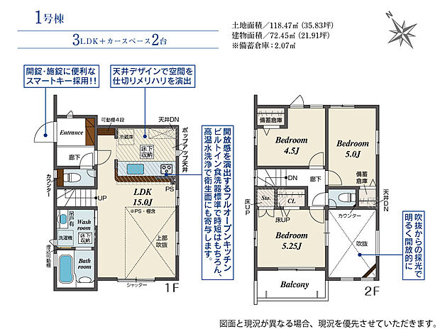 - 「建築条件付き土地」の「建物プラン例」は、土地購入者の設計プランの一例であり、プランの採用可否は任意です。