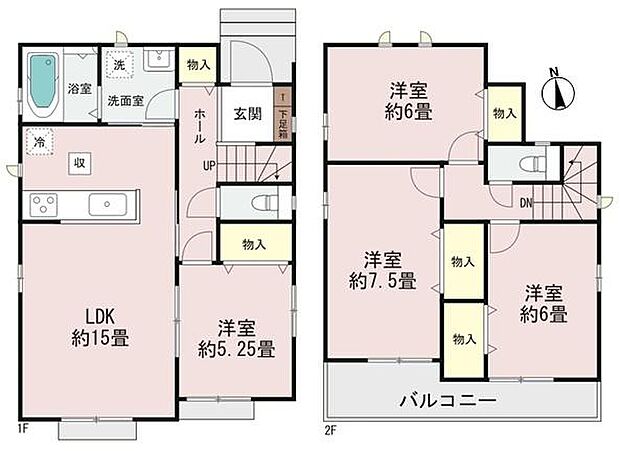 | 間取り | 4LDK 間取り内訳:リビングダイニングキッチン 15帖(1階)・洋室 5.2帖(1階)・洋室 7.5帖(2階)・洋室 6帖(2階)・洋室 6帖(2階) |