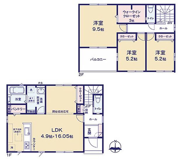 | 間取り | 3LDK 間取り内訳:リビングダイニングキッチン 20.9帖(1階)・洋室 9.5帖(2階)・洋室 5.2帖(2階)・洋室 5.2帖(2階) |