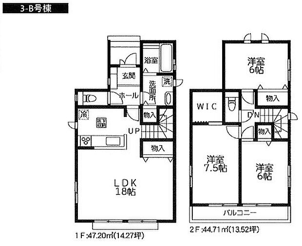 | 間取り | 3LDK 間取り内訳:リビングダイニングキッチン 18帖(1階)・洋室 7.5帖(2階)・洋室 6帖(2階)x2 |