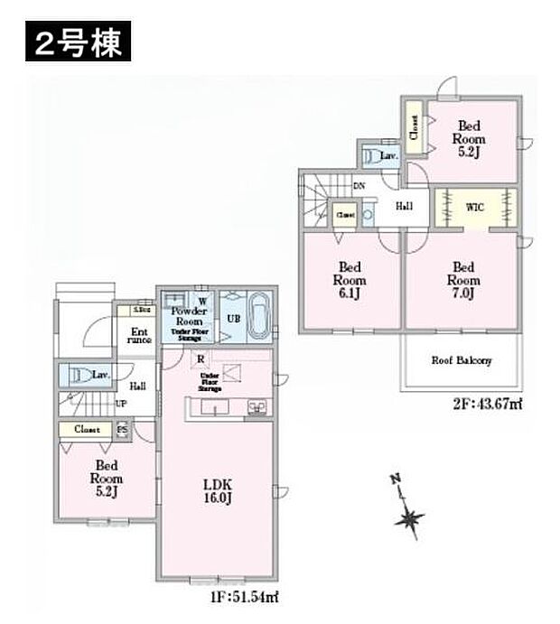 | 間取り | 4LDK 間取り内訳:リビングダイニングキッチン 16帖(1階)・洋室 5.2帖(1階)・洋室 7帖(2階)・洋室 6.1帖(2階)・洋室 5.2帖(2階) |