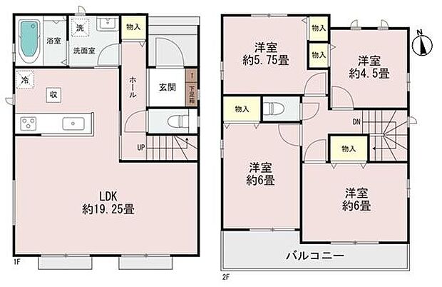 | 間取り | 4LDK 間取り内訳:リビングダイニングキッチン 19.2帖(1階)・洋室 6帖(2階)・洋室 6帖(2階)・洋室 5.7帖(2階)・洋室 4.5帖(2階) |