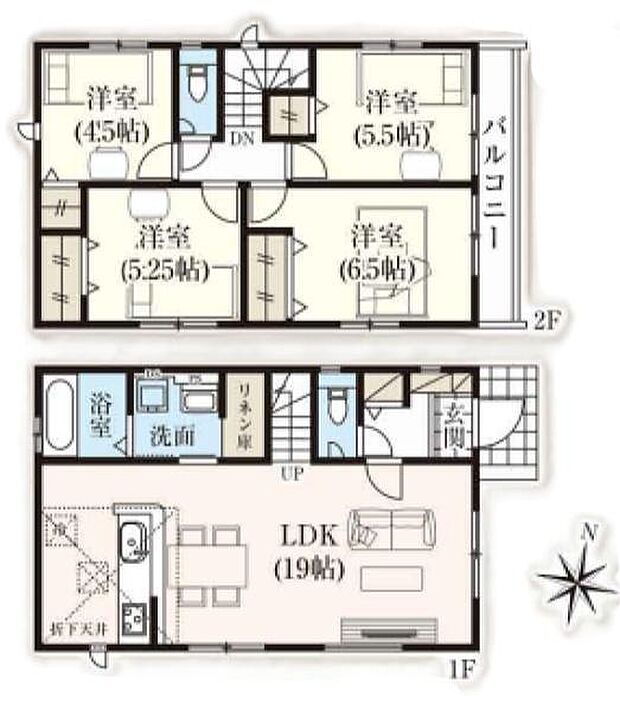 | 間取り | 4LDK 間取り内訳:リビングダイニングキッチン 19帖(1階)・洋室 6.5帖(2階)・洋室 5.5帖(2階)・洋室 5.2帖(2階)・洋室 4.5帖(2階) |