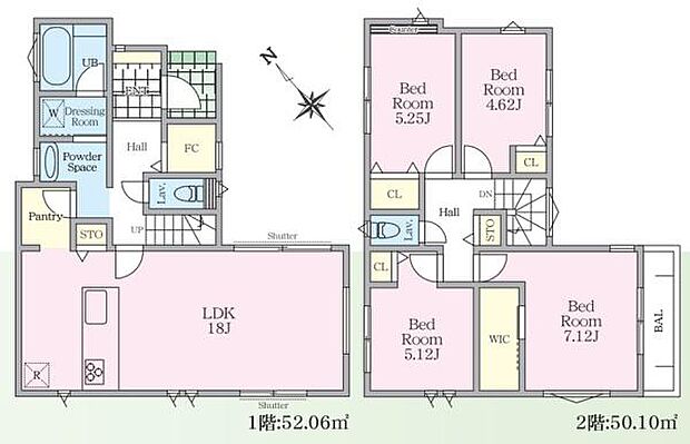 | 間取り | 4LDK 間取り内訳:リビングダイニングキッチン 18帖(1階)・洋室 7.1帖(2階)・洋室 5.2帖(2階)・洋室 5.1帖(2階)・洋室 4.6帖(2階) |