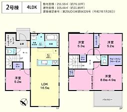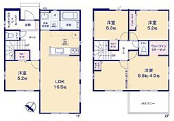 | 間取り | 4LDK 間取り内訳:リビングダイニングキッチン 16.5帖(1階)・洋室 5.2帖(1階)・洋室 5.3帖(2階)・洋室 13.7帖(2階)・洋室 5.2帖(2階) |