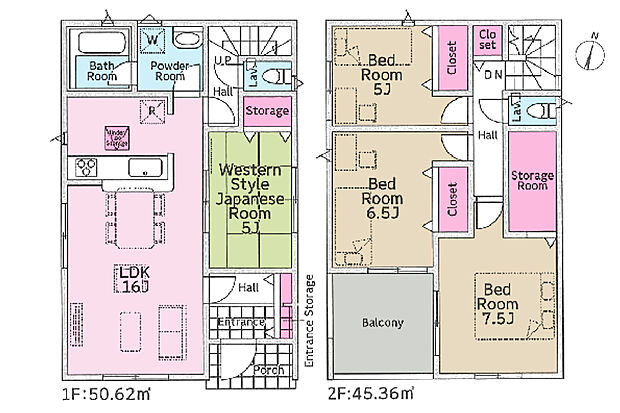 | 間取り | 4SLDK 間取り内訳:リビングダイニングキッチン 16帖(1階)・和室 5畳(1階)・洋室 7.5帖(2階)・洋室 6.5帖(2階)・洋室 5帖(2階)・収納(2階) |