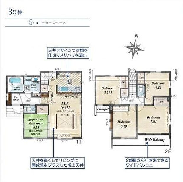 | 間取り | 5LDK 間取り内訳:リビングダイニングキッチン 16.3帖(1階)・和室 4.5畳(1階)・洋室 7帖(2階)・洋室 5.2帖(2階)・洋室 5帖(2階)・洋室 4.5帖(2階) |