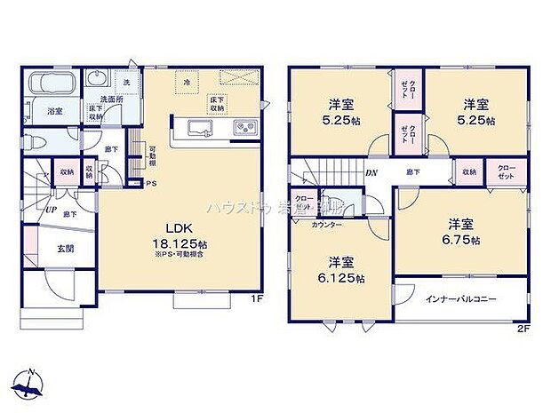 | 間取り | 4LDK 間取り内訳:リビングダイニングキッチン 18.1帖(1階)・洋室 6.7帖(2階)・洋室 6.1帖(2階)・洋室 5.2帖(2階)・洋室 5.2帖(2階) |