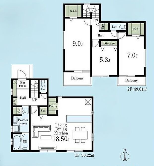| 間取り | 3LDK 間取り内訳:リビングダイニングキッチン 18.5帖(1階)・洋室 9帖(2階)・洋室 5.3帖(2階)・洋室 7帖(2階) |