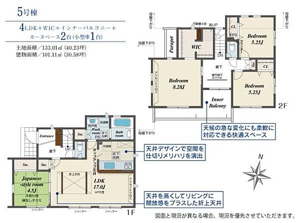 間取り内訳:リビングダイニングキッチン 17帖(1階)・和室 4.5畳(1階)・洋室 8.2帖(2階)・洋室 5.2帖(2階)・洋室 5.2帖(2階)