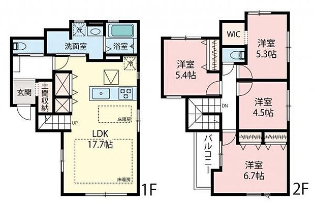 | 間取り | 4LDK 間取り内訳:リビングダイニングキッチン 17.7帖(1階)・洋室 6.7帖(2階)・洋室 5.4帖(2階)・洋室 5.3帖(2階)・洋室 4.5帖(2階) |