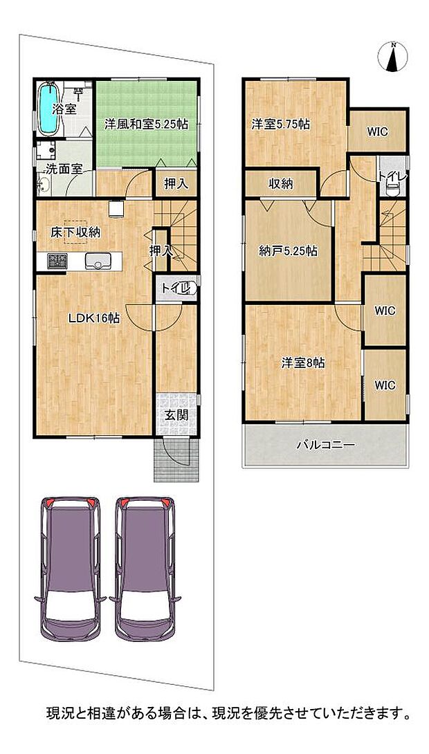| 間取り | 3SLDK 間取り内訳:リビングダイニングキッチン 16帖(1階)・和室 5.2畳(1階)・洋室 8帖(2階)・洋室 5.7帖(2階)・収納 5.2帖(2階) |