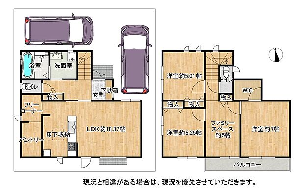 | 間取り | 4LDK 間取り内訳:リビングダイニングキッチン 18.3帖(1階)・洋室 7帖(1階)・洋室 5.2帖(2階)・洋室 5帖(2階)・その他 5帖(2階) |