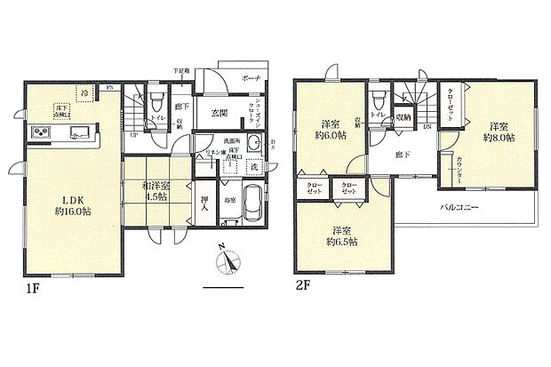 | 間取り | 4LDK 間取り内訳:リビングダイニングキッチン 16帖(1階)・和室 4.5畳(1階)・洋室 8帖(2階)・洋室 6.5帖(2階)・洋室 6帖(2階) |
