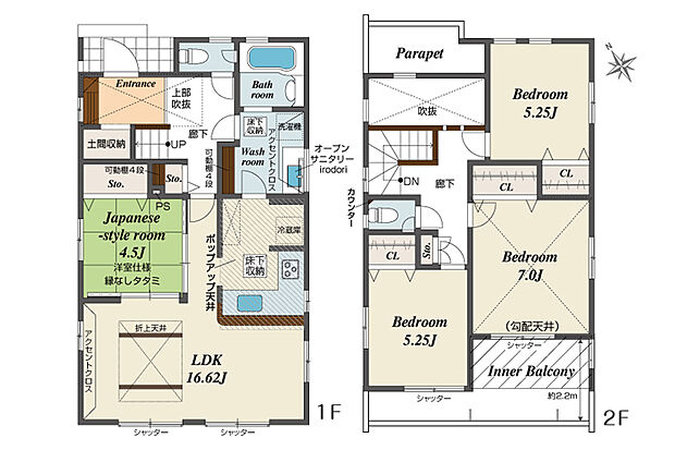 間取り内訳:リビングダイニングキッチン 16.6帖(1階)・和室 4.5畳(1階)・洋室 7帖(2階)・洋室 5.2帖(2階)x2