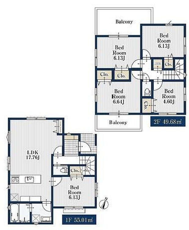 間取り内訳:リビングダイニングキッチン 17.7帖(1階)・洋室 6.1帖(1階)・洋室 6.6帖(2階)・洋室 6.1帖(2階)・洋室 6.1帖(2階)・洋室 4.6帖(2階)
