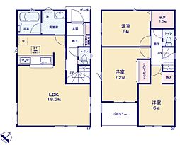 | 間取り | 3LDK 間取り内訳:リビングダイニングキッチン 18.5帖・洋室 7.2帖・洋室 6帖x2・収納 1.5帖 |