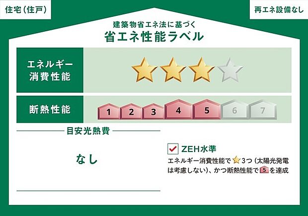 - 星マークの数が多いほどエネルギー消費性能が高いことを示しています。再エネ設備のない住宅は★0~★4の5段階評価、再エネ設備がある住宅は★0~★6の7段階評価となります。