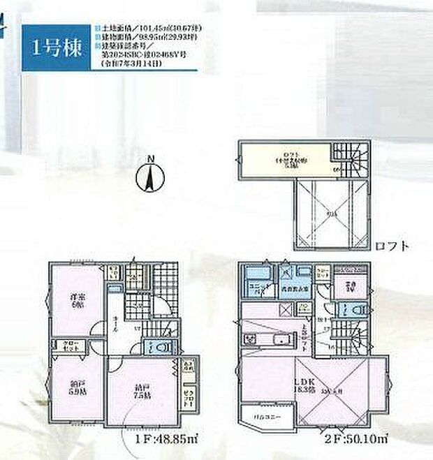 | 間取り | 2SLDK 間取り内訳:洋室 6帖(1階)・収納 5.9帖(1階)・収納 7.5帖(1階)・リビングダイニングキッチン 18.3帖(2階)・その他 5.7帖 |
