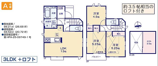 | 間取り | 3LDK(3LDK) 間取り内訳:リビングダイニングキッチン 13帖(1階)・洋室 4.5帖(2階)・洋室 5.2帖(2階)x2・その他 3.5帖 |