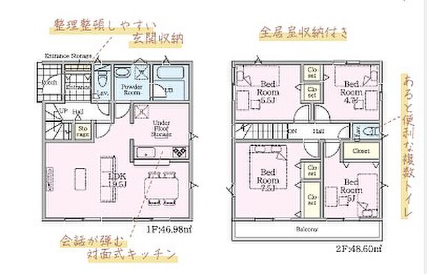 | 間取り | 4LDK 間取り内訳:リビングダイニングキッチン 19.5帖(1階)・洋室 7.5帖(2階)・洋室 5.5帖(2階)・洋室 5帖(2階)・洋室 4.7帖(2階) |