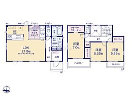 | 間取り | 3LDK 間取り内訳:リビングダイニングキッチン 21.5帖(1階)・洋室 7帖(2階)・洋室 5.2帖(2階)・洋室 5.2帖(2階) |