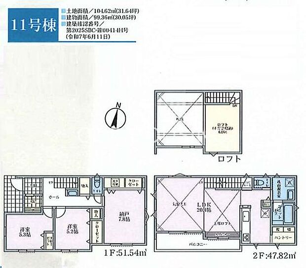 間取り内訳:洋室 5.2帖(1階)・収納 7.8帖(1階)・リビングダイニングキッチン 20.1帖(2階)・その他 6帖・洋室 5.3帖(1階)