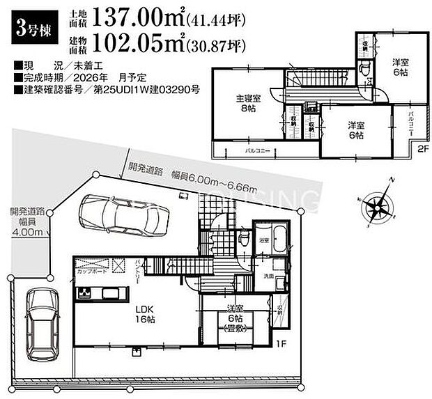 | 間取り | 4LDK 間取り内訳:リビングダイニングキッチン 16帖(1階)・洋室 6帖(1階)・洋室 8帖(2階)・洋室 6帖(2階)・洋室 6帖(2階) |