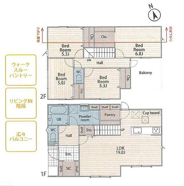 | 間取り | 4LDK 間取り内訳:洋室 6.8帖(2階)・リビングダイニングキッチン 19帖(1階)・洋室 5.3帖(2階)・洋室 5帖(2階)・洋室 5.3帖(2階) |