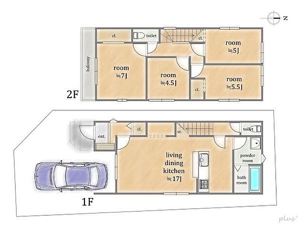 | 間取り | 4LDK 間取り内訳:リビングダイニングキッチン 17帖(1階)・洋室 7帖(2階)・洋室 5.5帖(2階)・洋室 5帖(2階)・洋室 4.5帖(2階) |