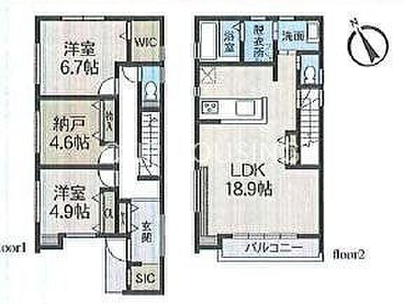 | 間取り | 2LDK 間取り内訳:洋室 6.7帖(1階)・洋室 4.9帖(1階)・収納 4.6帖(1階)・リビングダイニングキッチン 18.9帖(2階) |