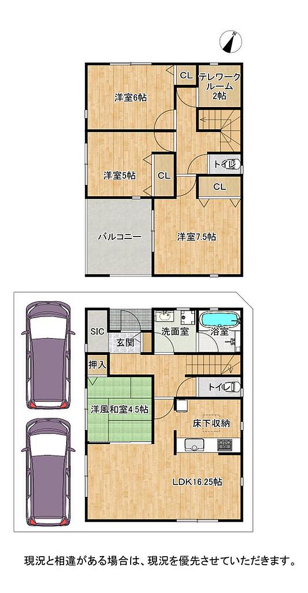 | 間取り | 4LDK 間取り内訳:リビングダイニングキッチン 16.2帖(1階)・和室 4.5畳(1階)・洋室 7.5帖(2階)・洋室 6帖(2階)・洋室 5帖(2階) |