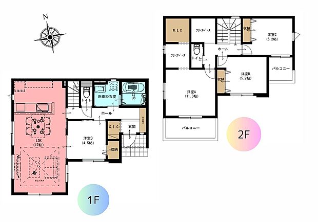 | 間取り | 4SLDK 間取り内訳:リビングダイニングキッチン 17帖(1階)・洋室 4.5帖(1階)・洋室 5.2帖(2階)・洋室 5.2帖(2階)・洋室 11.5帖(2階)・収納 2帖(2階)・収納 2帖(2階) |