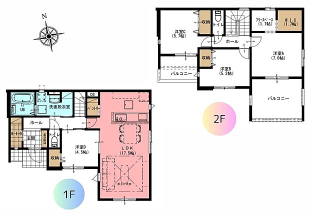| 間取り | 4SLDK 間取り内訳:リビングダイニングキッチン 17.5帖(1階)・洋室 4.5帖(1階)・洋室 5.2帖(2階)・洋室 5.7帖(2階)・洋室 7帖(2階)・収納 1.7帖(2階) |
