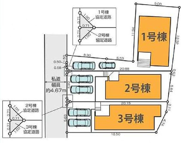 | 土地面積 | 126.50m2~151.73m2<私道負担あり:43.42m2×持分7/10~43.42m2×持分7/10> | ||