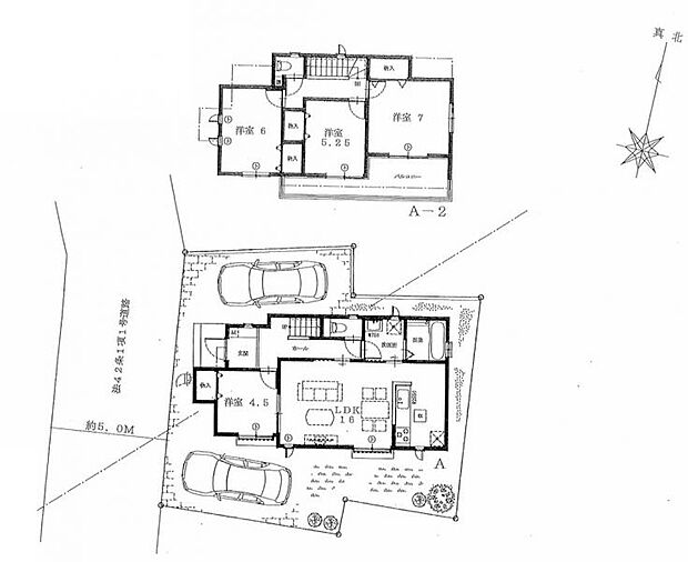 | 間取り | 4LDK 間取り内訳:洋室 6帖(2階)・洋室 5.2帖(2階)・リビングダイニングキッチン 16帖(1階)・洋室 4.5帖(1階)・洋室 7帖(2階) |