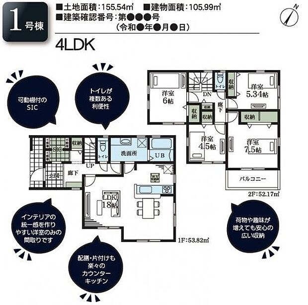 | 間取り | 4LDK 間取り内訳:洋室 5.3帖(2階)・洋室 4.5帖(2階)・リビングダイニングキッチン 18帖(1階)・洋室 7.5帖(2階)・洋室 6帖(2階) |
