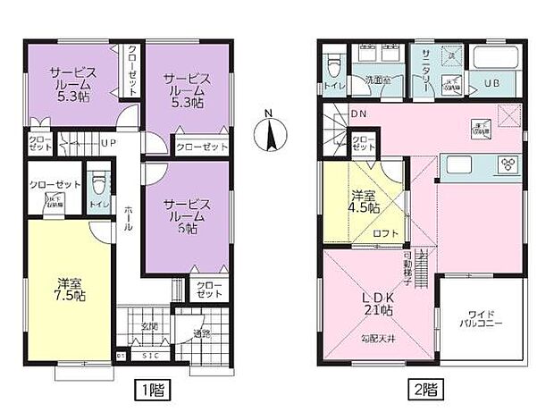 | 間取り | 2SLDK 間取り内訳:リビングダイニングキッチン 21帖(2階)・洋室 4.5帖(2階)・洋室 7.5帖(1階)・収納 6帖(1階)・収納 5.3帖(1階)・収納 5.3帖(1階) |