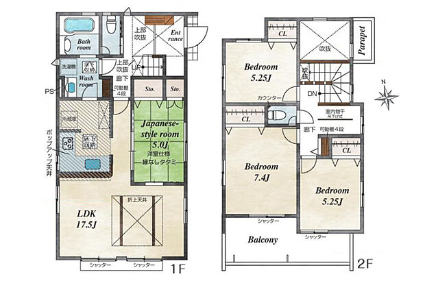 | 間取り | 4LDK 間取り内訳:和室 5畳(1階)・洋室 7.4帖(2階)・洋室 5.2帖(2階)x2・リビングダイニングキッチン 17.5帖(1階) |